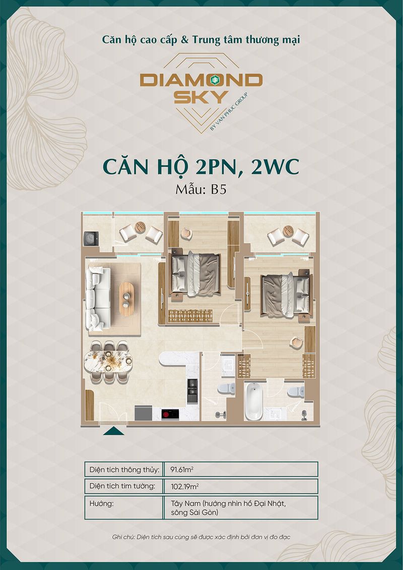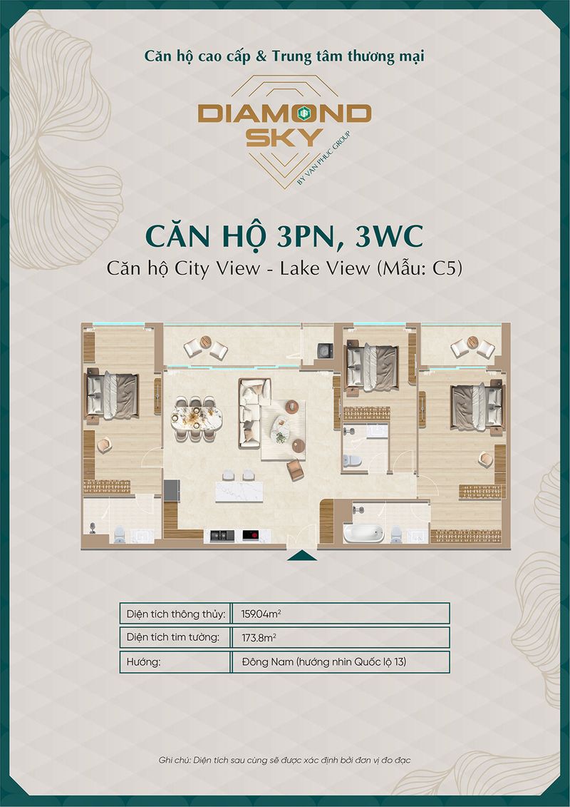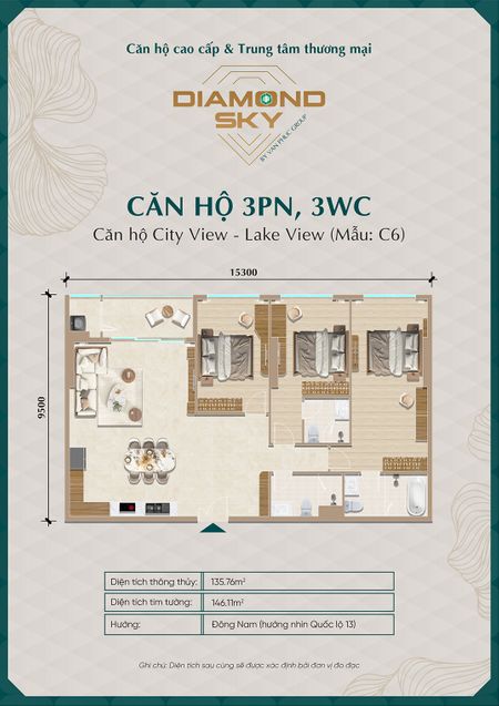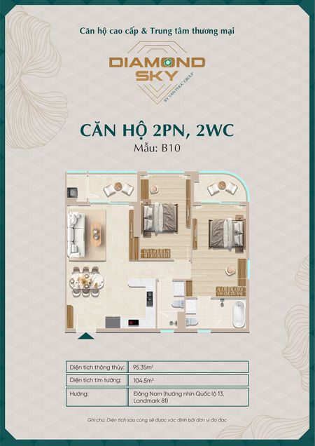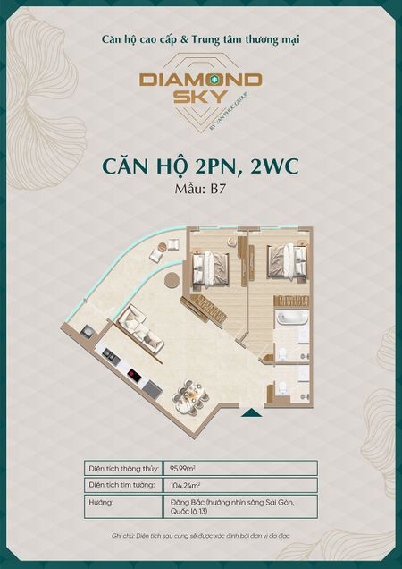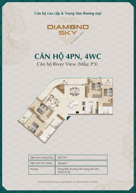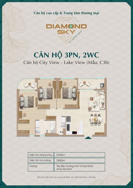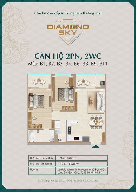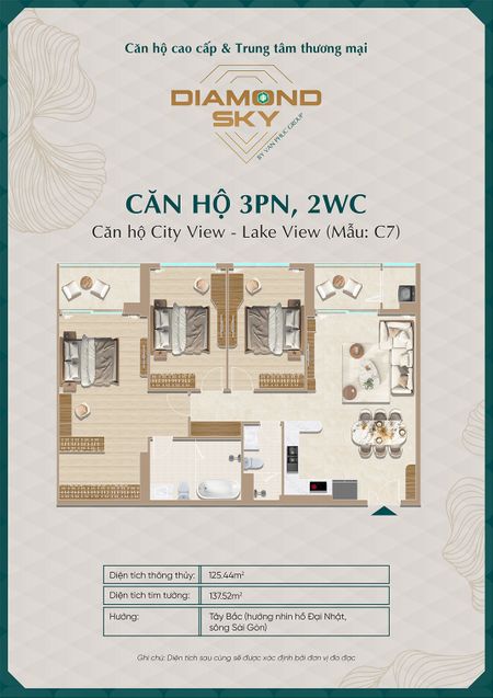 Căn hộ 3 phòng ngủ tại Diamond Sky được thiết kế rộng rãi, tối ưu công năng sử dụng, phù hợp cho gia đình nhiều thành viên hoặc khách hàng tìm kiếm không gian sống cao cấp.