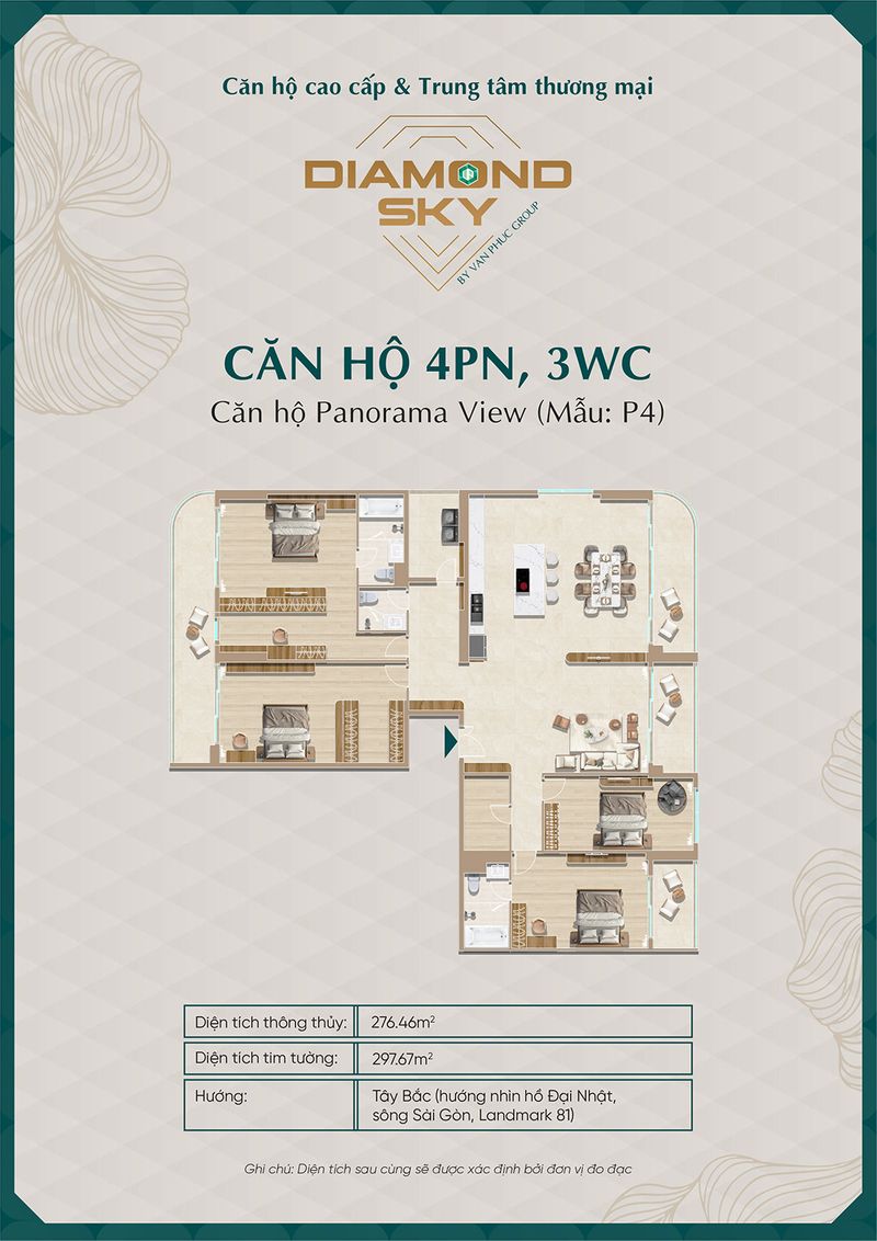 Căn hộ 4 phòng ngủ tại Diamond Sky sở hữu diện tích lớn, thiết kế tối ưu cho gia đình nhiều thế hệ hoặc khách hàng tìm kiếm không gian sống đẳng cấp. Không gian sinh hoạt chung được bố trí rộng rãi, kết nối liền mạch giữa phòng khách – bếp – ban công, tạo nên sự thoáng đãng và sang trọng.