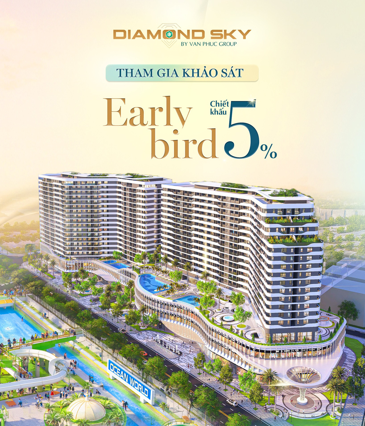 Căn hộ Diamond Sky là tổ hợp căn hộ cao cấp và khách sạn 5 sao sang trọng, được xây dựng trên tổng diện tích 17.581m², nằm bên cạnh công viên giải trí Ocean World với tầm nhìn hướng ra sông Sài Gòn. Với mật độ xây dựng lý tưởng chỉ 40%, dự án dành phần lớn không gian cho cảnh quan và tiện ích. Toàn bộ kiến trúc và cảnh quan được thiết kế bởi HBA (Mỹ), đơn vị thiết kế danh tiếng toàn cầu.